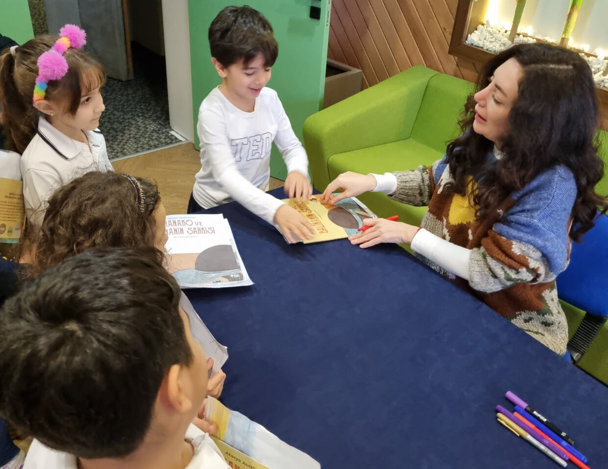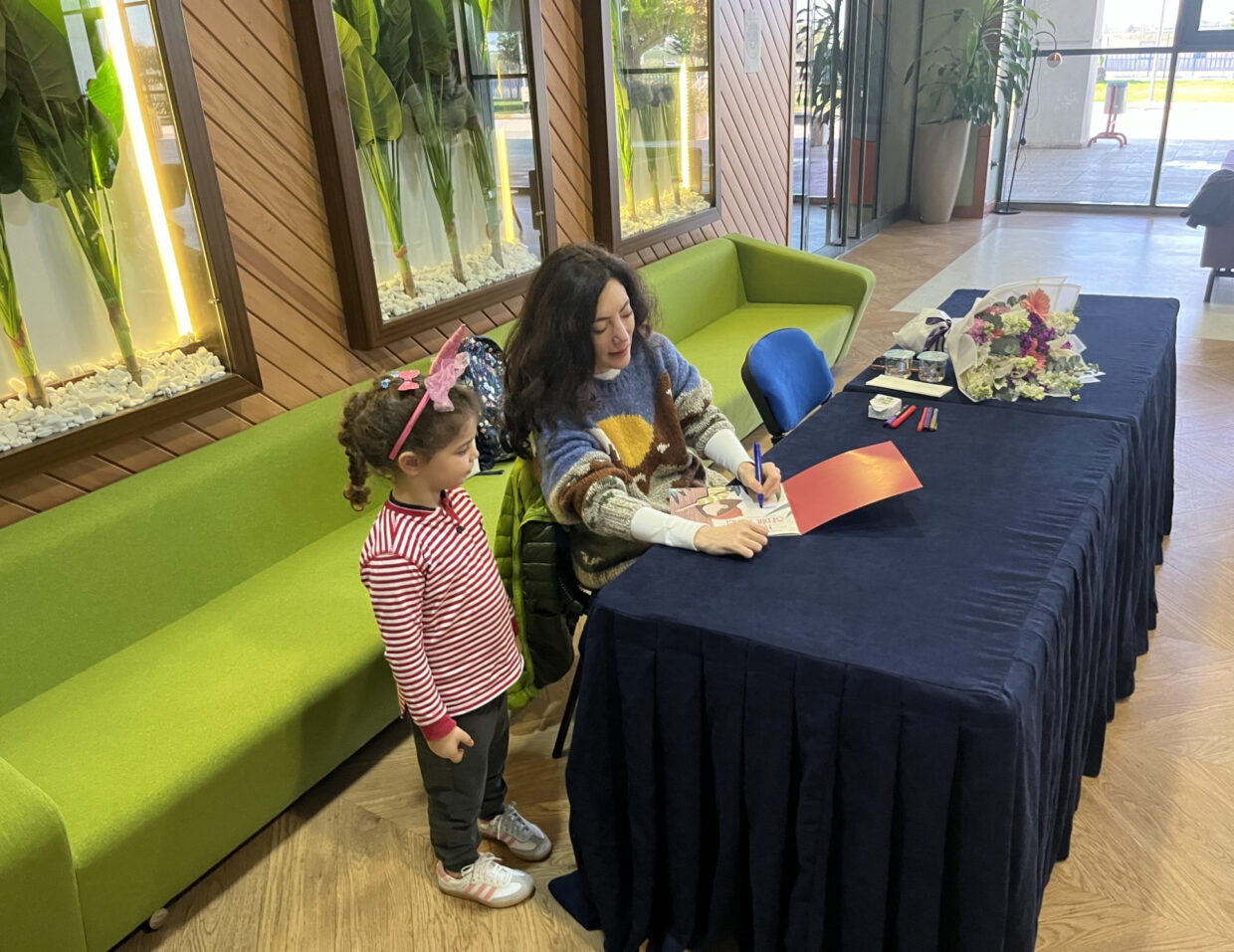 Etkinlik sonrası Fuaye alanında düzenlenen imza gününde yazar; doğa sevgisi, dayanışma ve çevre bilincini konu alan “Hanako ve Balinanın Şarkısı” ile “Hanako ve Sedir Ağacı” kitaplarını öğrencilerimiz için imzaladı.