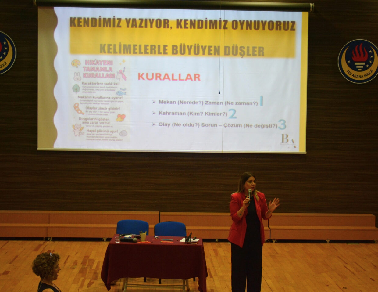 TED Adana Koleji olarak, edebiyatımıza değerli eserler kazandırmış sanatçılarımızla söyleşi ve imza günleri kapsamında davet ettiğimiz yazar Banu AKELOĞLU 3. Sınıf öğrencileri ile “Kelimelerle Büyüyen Düşler” temalı öykü, drama atölyesi düzenlemiştir. Öğrencilerimiz yaratıcılıklarının ve hayal güçlerinin sınırlarını zorlayarak birbirinden güzel öykü yazma ve bu öyküleri dramaya dönüştürme fırsatı yakalamışlardır. Keyifle geçen bu atölye için yazarımıza, öğrenci ve öğretmenlerimize teşekkür ederiz.